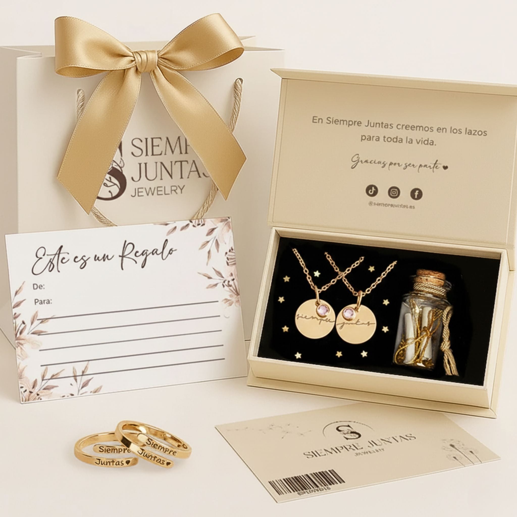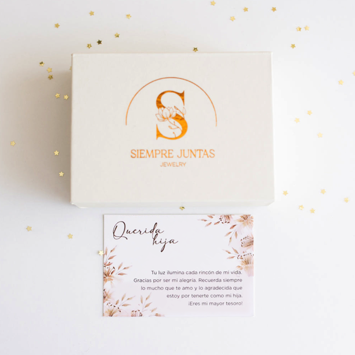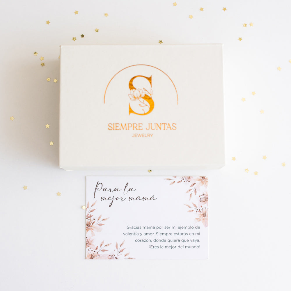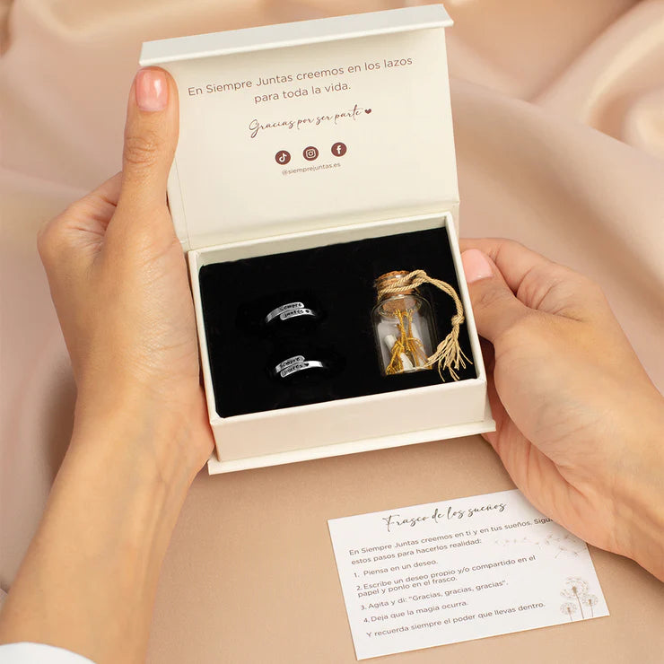 Incluye 2 de nuestros anillos grabados “Siempre Juntas ♥”, que representa ese vínculo que las une para siempre, y 2 pulseras Nudo Infinito, diseñadas para representar un lazo que nunca las separará.