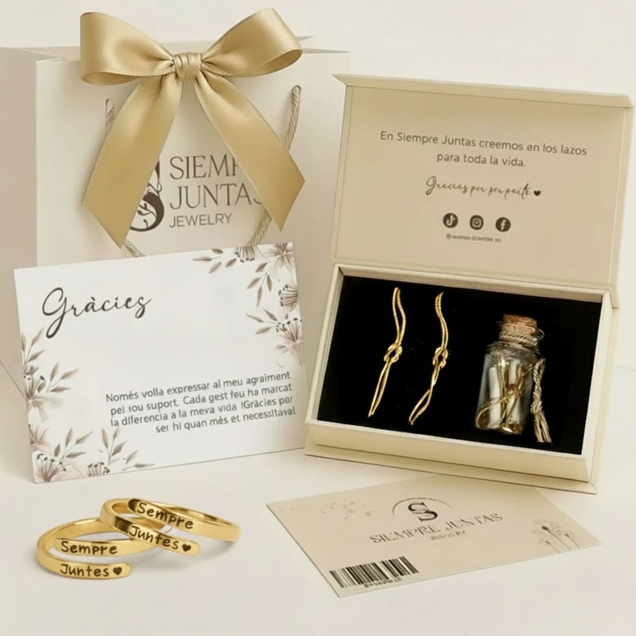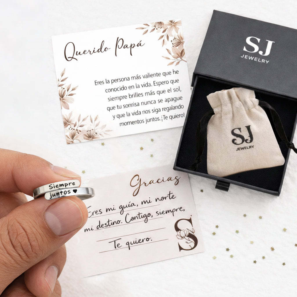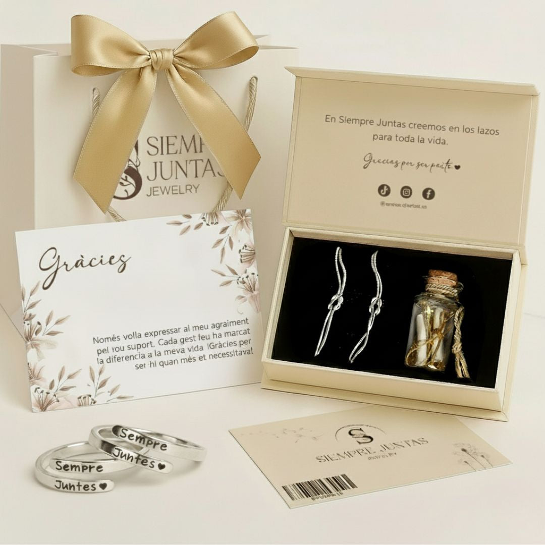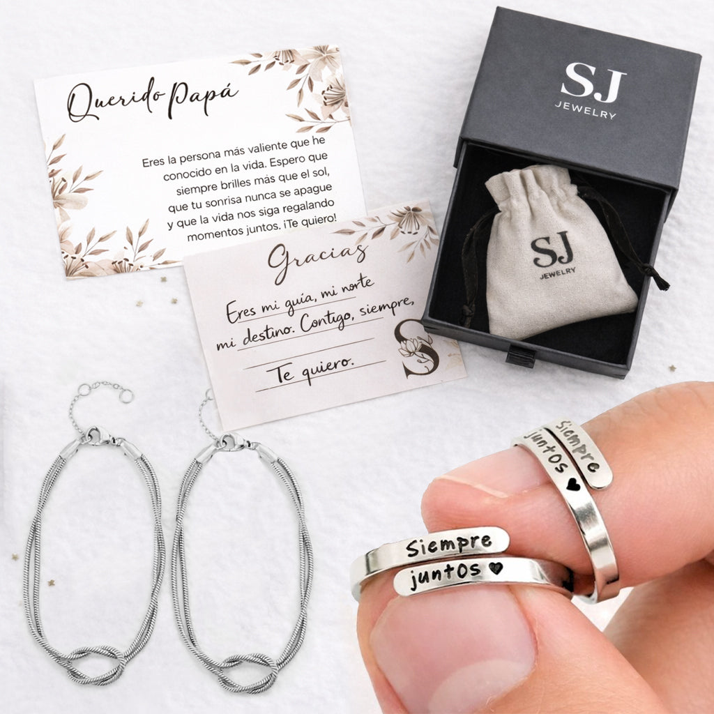 Incluye 2 de nuestros anillos grabados “Siempre Juntas ♥”, que representa ese vínculo que las une para siempre, y 2 pulseras Nudo Infinito, diseñadas para representar un lazo que nunca las separará.